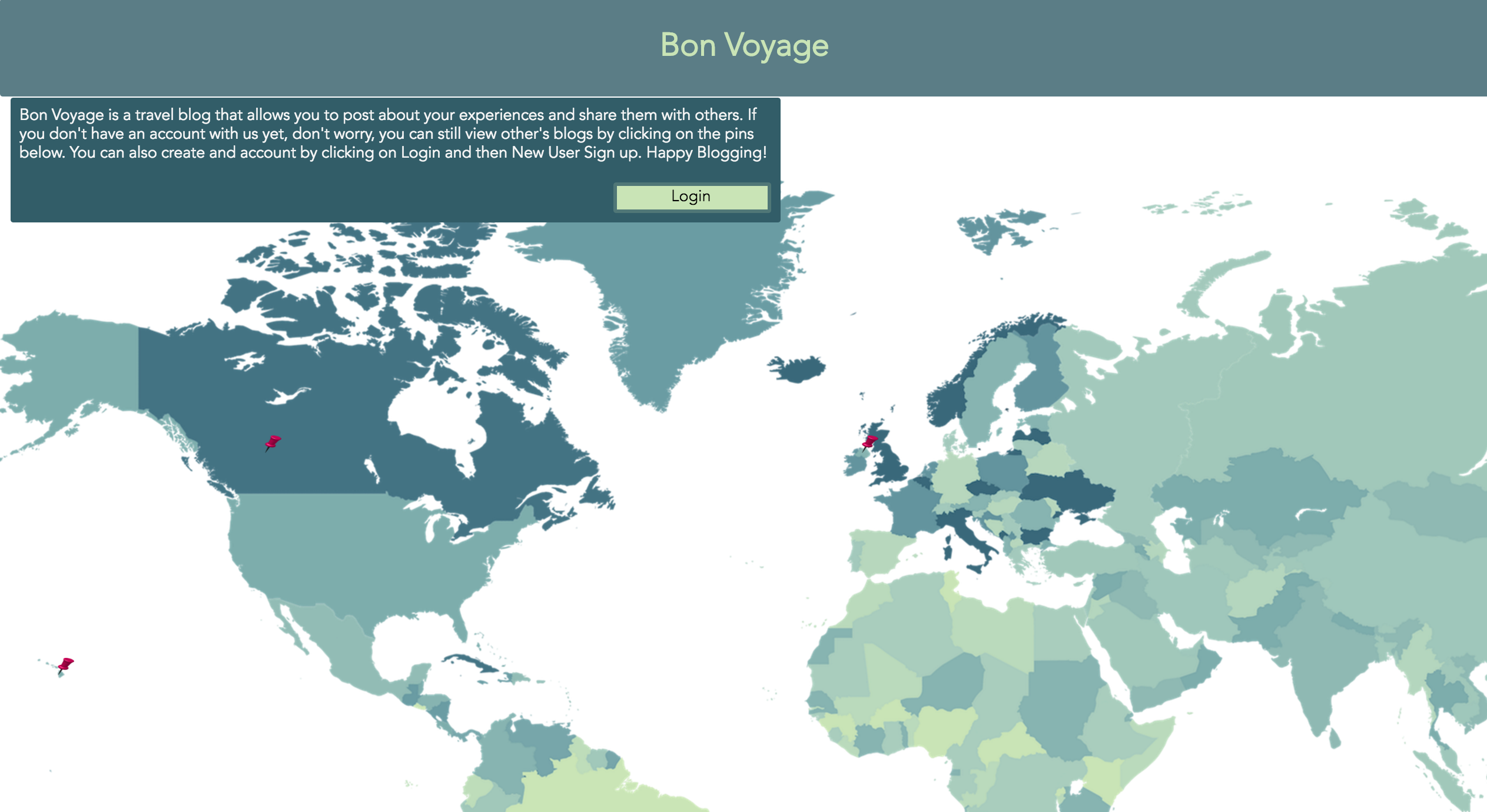 Bon Voyage is an interactive travel blog that allows people to share their traveling experiences as well as view others' experiences. All posts are visible on the map marked by thumb tacks.